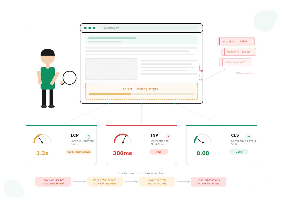 Ad tech is one of the biggest drivers of poor Core Web Vitals performance. Understanding how ads impact LCP, INP, and CLS is key to improving page speed.